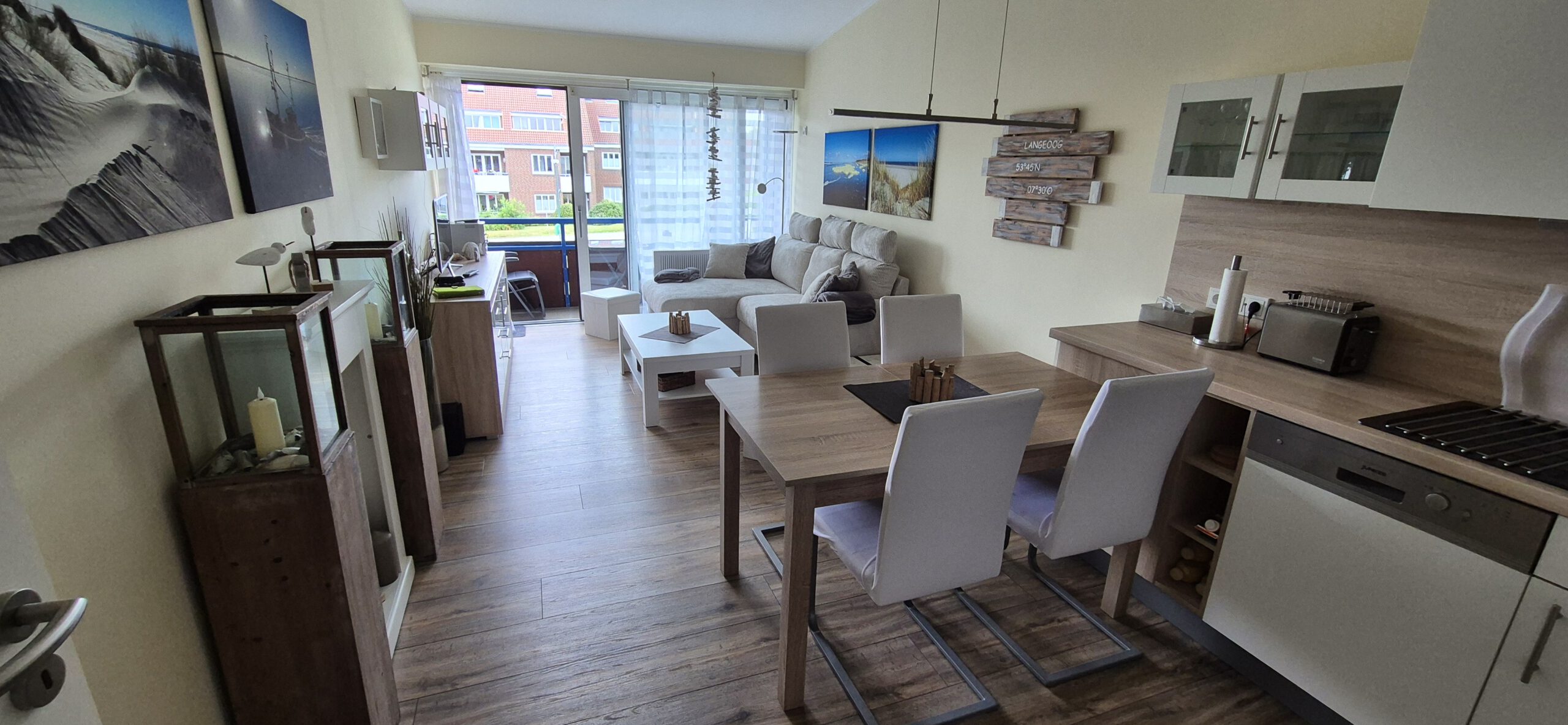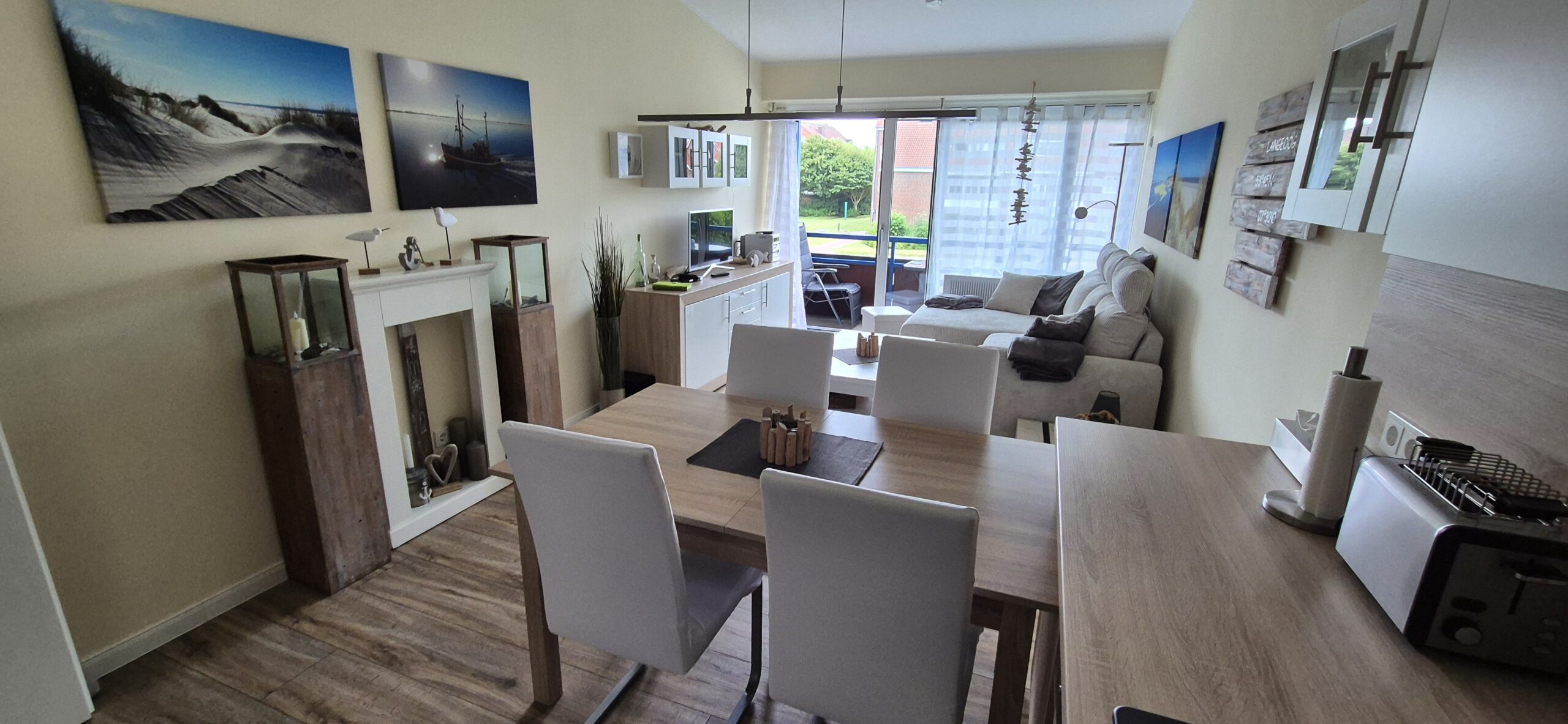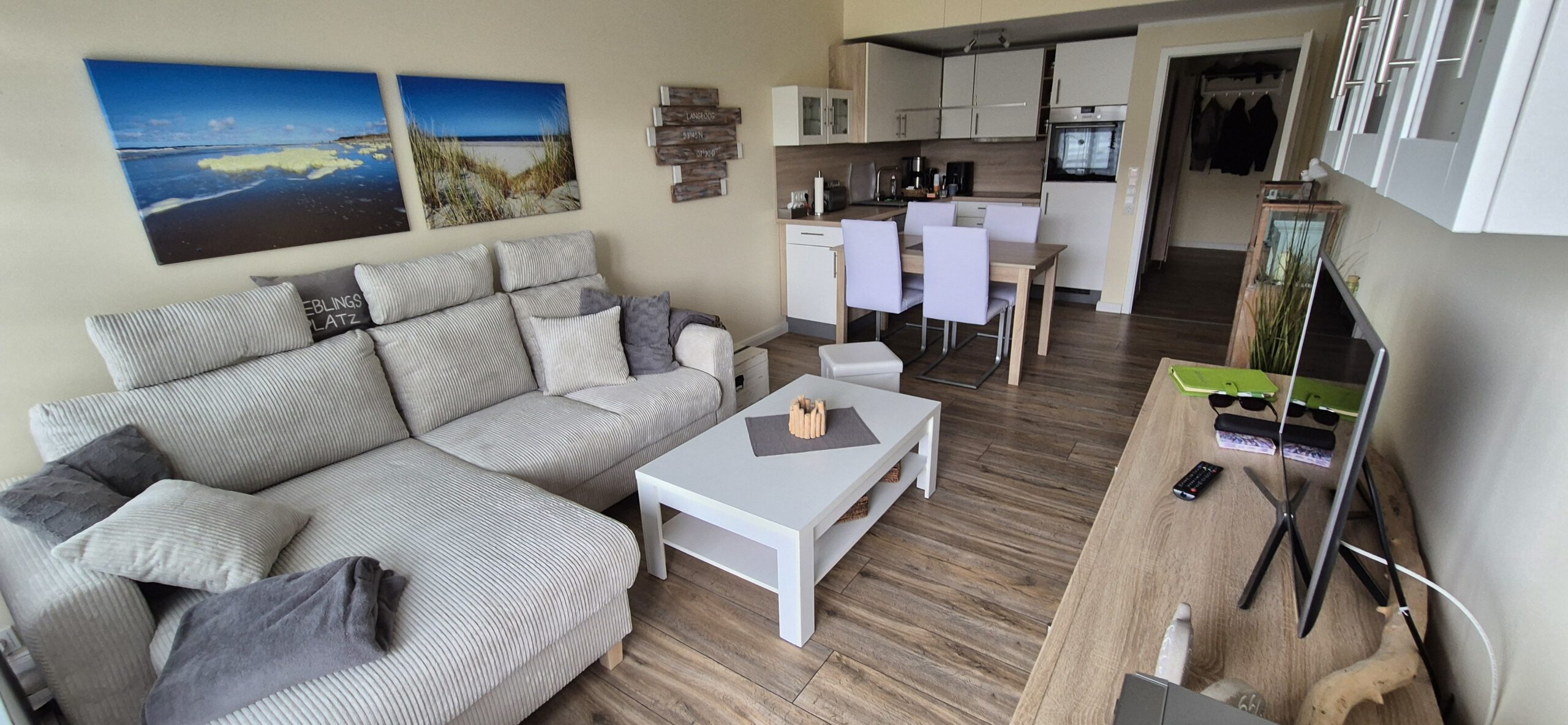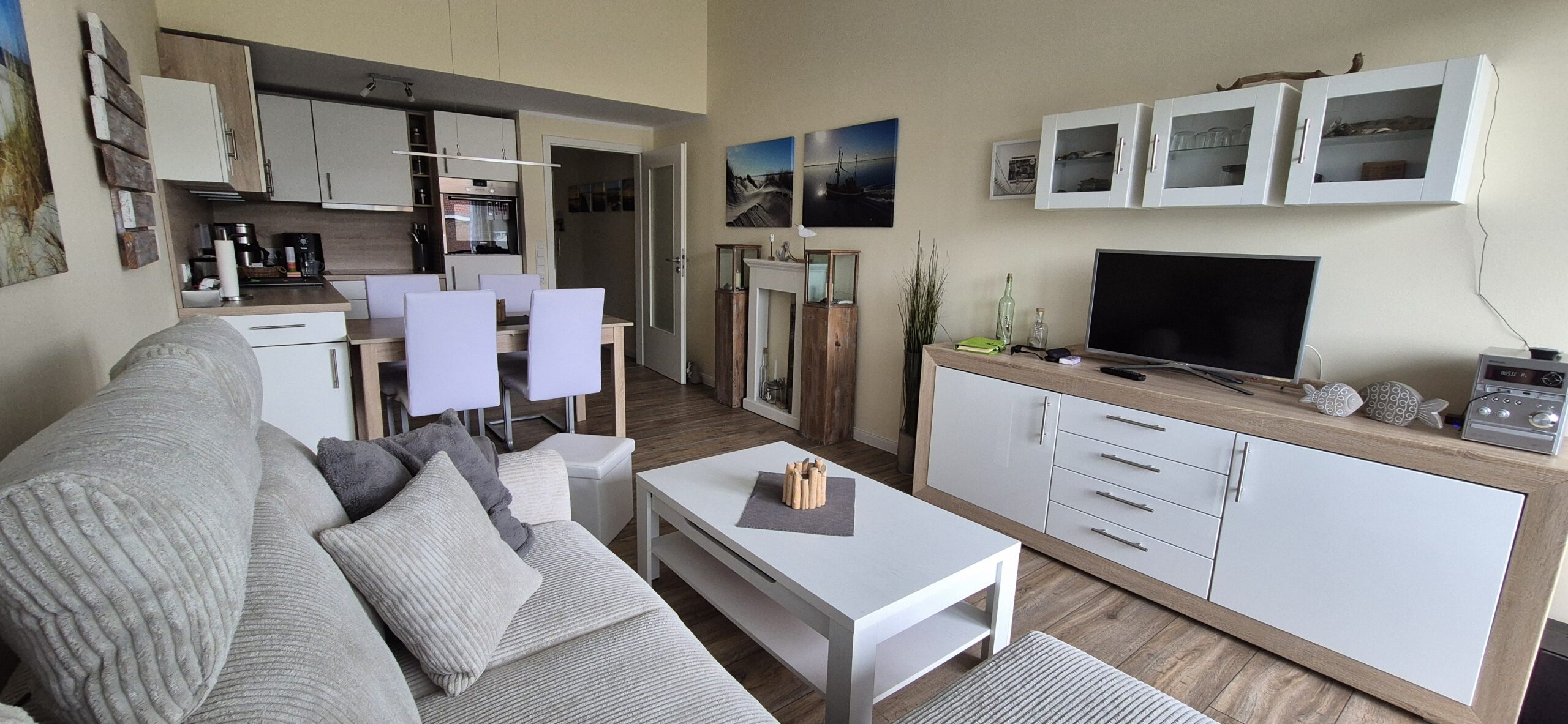 Wohnbereich: Das gemütlich eingerichtete Wohnzimmer (Fernseher und DVD-Player sind vorhanden) hat eine offene Küche und einen angrenzendem Essplatz. Ein Sideboard bietet viel Stauraum. Die voll ausgestattete Küche bietet unter anderem Kaffeemaschine, Toaster, Wasserkocher und einen Mixer. Geschirrspüler, Induktions-Herd, Back-/Grillkombination, Heißluftfritteuse und Mikrowelle sind ebenso vorhanden.